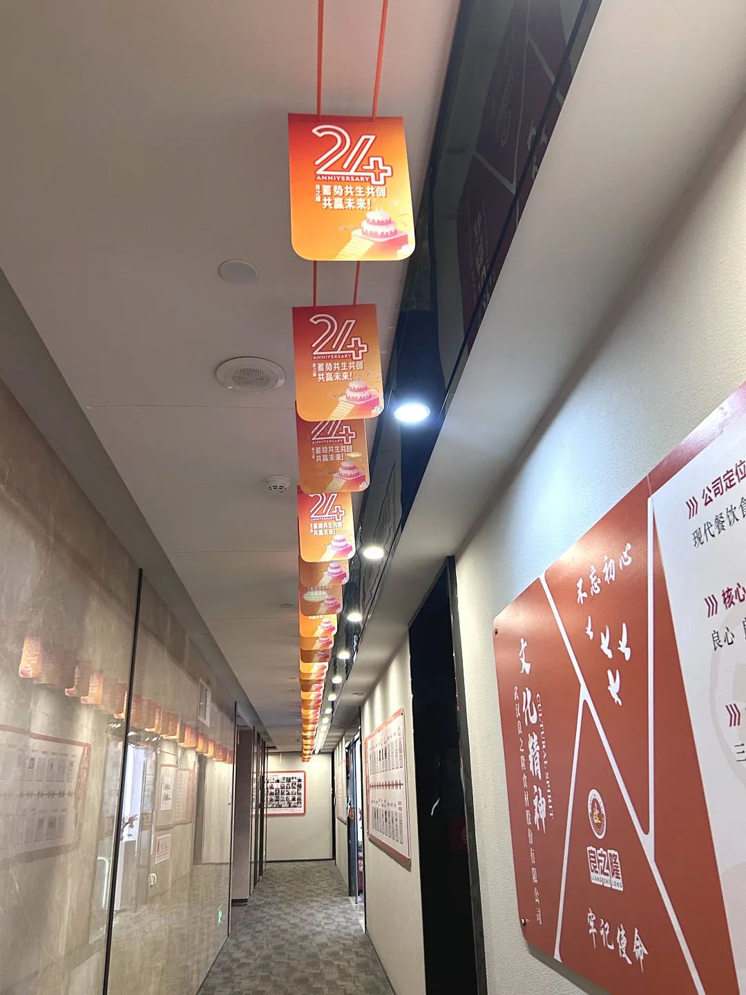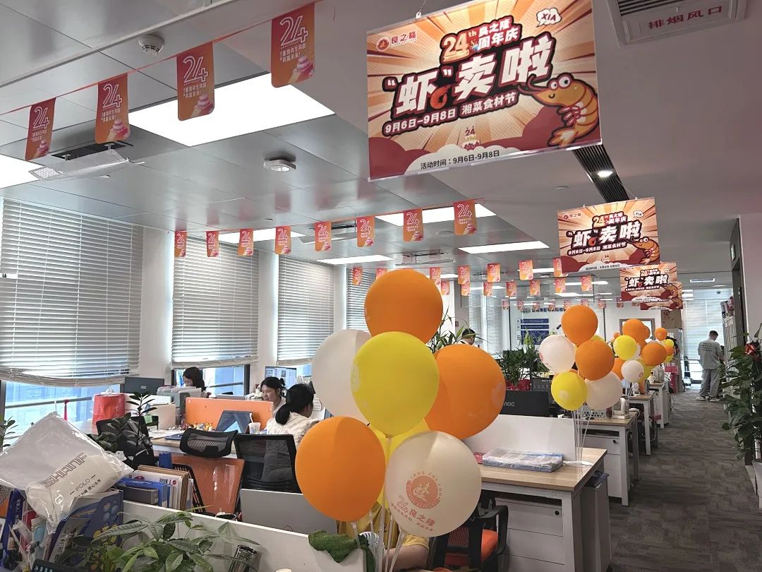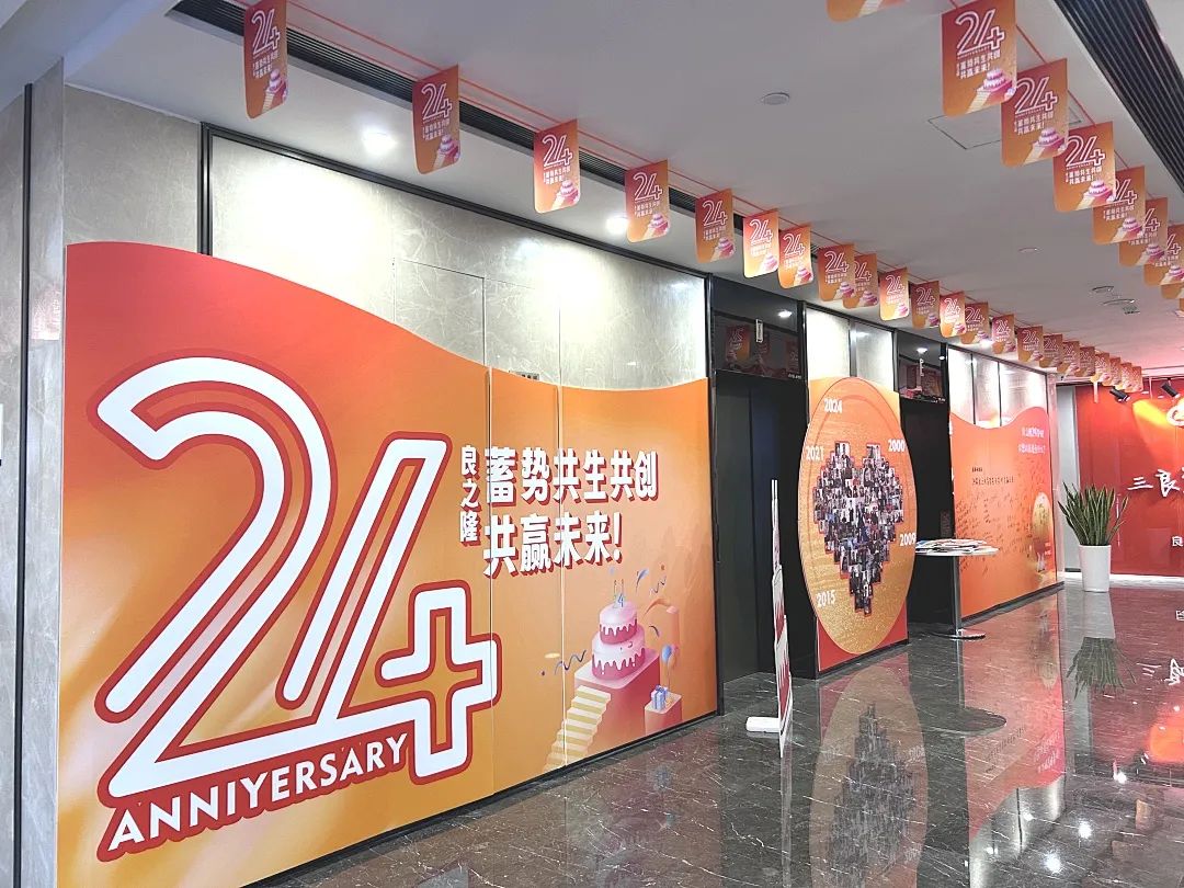 公司总部及全国各门店在公共区域、办公场所精心布置,通过在门头、前台、中庭、办公区域张贴24周年活动标识、宣传标语、吊旗等方式,全面营造隆重热烈、喜庆活泼的庆祝气氛。
